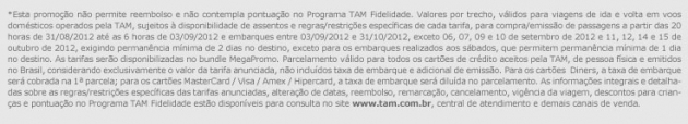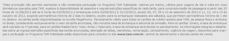 A promoção é válida para viagens de ida e volta a serem realizadas no período de 3 de setembro a 31 de outubro deste ano, menos em feriados, e com permanência mínima de dois dias no destino, com exceção dos embarques realizados aos sábados que permitem o retorno no dia seguinte. Vale ressaltar que as passagens adquiridas nessa oferta não pontuam no Programa TAM Fidelidade e não são reembolsáveis.