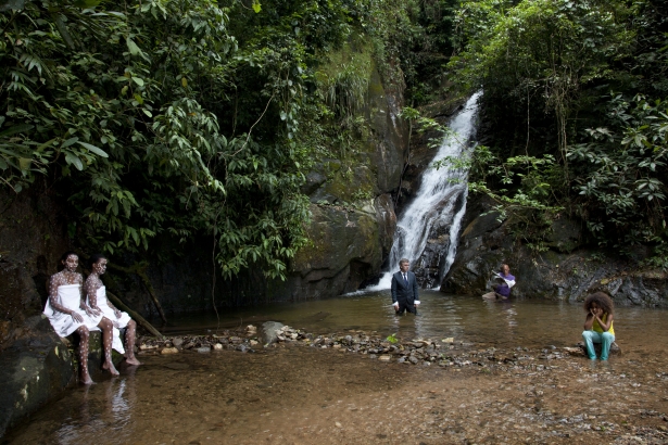 No Oi Futuro, serão apresentados trabalhos chamados por Rigobert de “programas fotográficos”, que combinam imagens reais com imagens virtuais criadas em computador. Neles, atores profissionais, figurantes e o próprio artista jogam com o isolamento dos personagens e a complexidade das relações que se instala entre eles, em imagens de extrema ambivalência. A proposta é dizer o mínimo possível para fazer com que o espectador imagine a história pessoal dos personagens. Estarão lá Flanders (2009), inspirado nos mestres flamengos como Brueghel, Van Eyck e Bosch, cujas pinturas exploram os demônios e fantasmas dos homens; e Jaywick (2010), que remete às inundações devastadoras de uma cidade costeira da Inglaterra, em 1953. Na parede será projetado o vídeo Predicament 13 (2011), que retrata uma cena numa cachoeira onde o artista contracena com duas meninas, em um ritual de iniciação do Candomblé. Em fotografia, Rigobert expõe mais quatro obras da série Predicament, ampliadas em metacrilato, onde um chefe indígena de uma tribo norte-americana – vestido caricaturalmente como em filmes – divide a cena com o artista que veste roupas pretas.