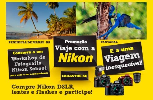 A Nikon do Brasil lançou ontem a promoção “Viaje com a Nikon”. Serão sorteadas dez viagens com workshop, sendo cinco para cada região a escolher: Pantanal ou Península de Marau. Os ganhadores terão direito de levar um acompanhante.