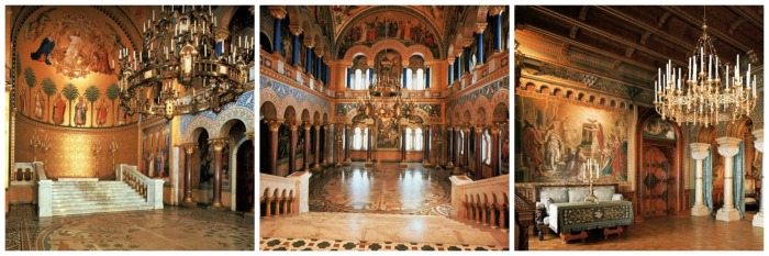 A arquitetura do castelo tem um estilo fantástico e serviu de inspiração para o “Castelo da Bela Adormecida” da Disneylândia, um símbolo dos estúdios Disney. Sua torre principal tem 90 metros de altura. Seu interior é dotado de características incomuns para a época, como água corrente em todos os aposentos, central de calefação interna e aparelhos telefônicos em diversos aposentos. O rei também tinha um dispositivo elétrico, tipo campainha, para chamar servos. A cozinha tinha água corrente fria e quente e tudo mais necessário a uma cozinha moderna.