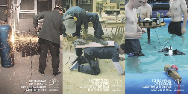 A campanha faz uma aviso: “Se você for fazer coisas estúpidas, pelo menos torne-se doador de órgãos. Porque, como doador, você pode doar até 8 órgãos e salvar até 8 vidas. O cérebro, contudo, não pode ser doado. E em alguns casos isso é uma coisa boa.”