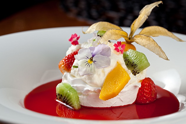 Para encerrar, destaque para a Pavlova de frutas e flores, uma deliciosa sobremesa preparada com merengue, chantilly de rosas, frutas e flores da estação com calda de hibisco.