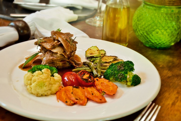 Cordeiro da Fazenda – perna de cordeiro ao molho de vinho com legumes assados