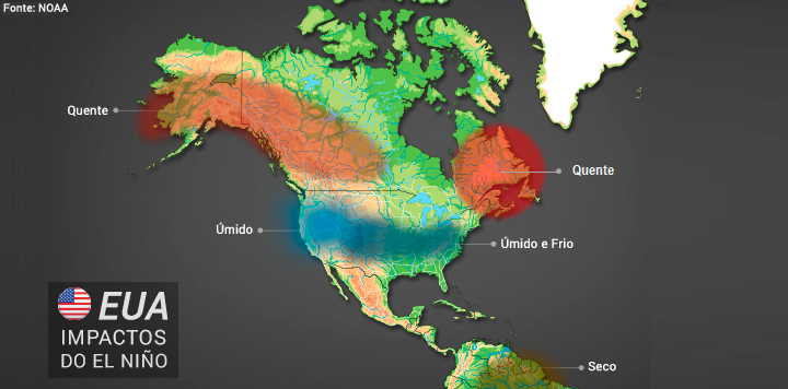 As mudanças na circulação dos ventos em diversos níveis atmosféricos provocadas pelo El Niño fazem com a porção norte/nordeste dos Estados Unidos receba menos ar polar, o que resulta em temperaturas acima do normal, menos frio e menos neve.