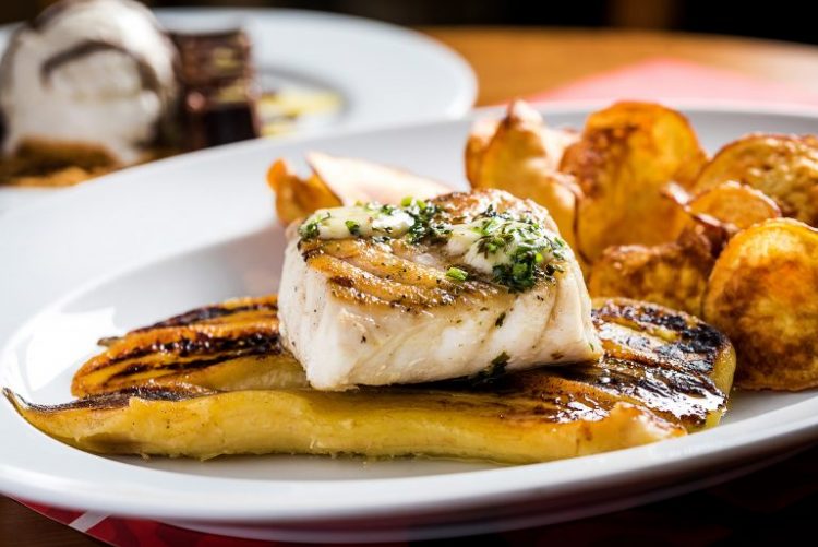 O Filé de Namorado Grelhado Banana Assada, Manteiga de Ervas e Chips de Batata Doce faz parte do Menu Restaurant Week da Camelo Pizzaria Ipanema.