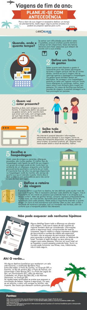 Pensando nisso, o CarroAluguel.com preparou o Infográfico Viagens de Fim de Ano, com dicas para você começar a se organizar e poder relaxar, curtir um momento especial ou conhecer novos lugares sem complicações futuras.