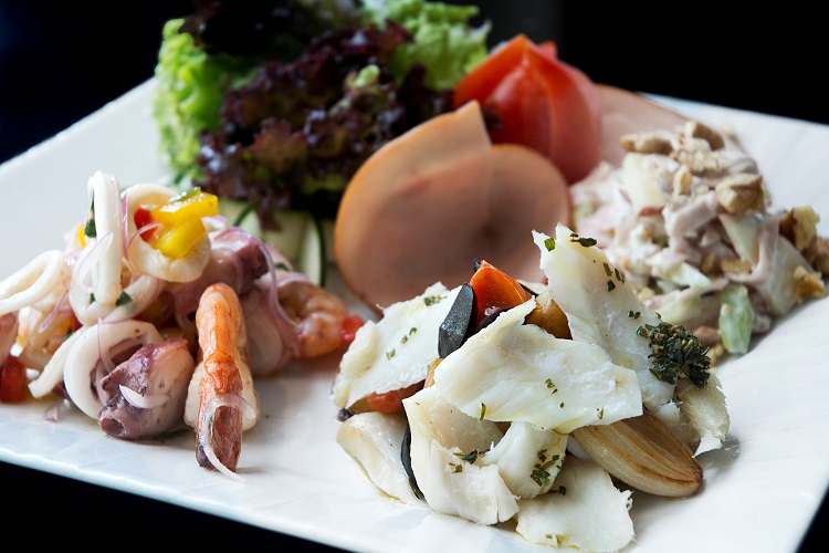 O buffet de frios oferece diversos pratos como: Salmão defumado, Cascata de camarões, Brioche de brie quente, Presunto Pata Negra, entre outros. Na parte dedicada aos pratos quentes há opções como Robalo com mousseline de camarões, Peru recheado com lagostins e Spring rolls de cordeiro.