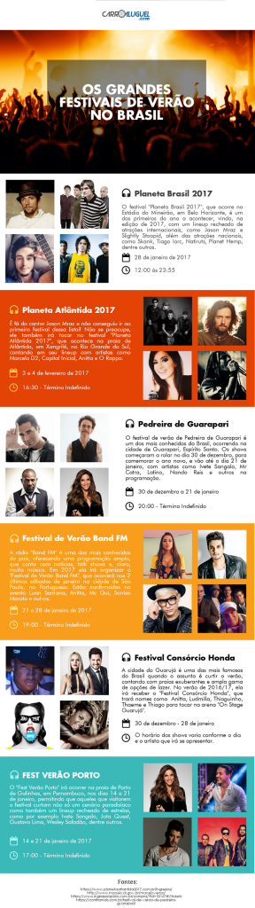 Confira no infográfico produzido pela CarroAluguel.com, alguns dos principais festivais de verão que vão acontecer no ano de 2017.