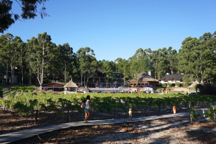 A área do Hyatt é imensa, quase toda ela um bosque de pinus e eucaliptos, recortado por ruas de terra impecáveis. A área edificada do hotel marca presença quando se chega à entrada. A porta enorme e pesada da recepção é uma obra de arte entalhada a mão na Indonésia, estilo que aliás empresta ao Hyatt uma atmosfera curiosa de elementos asiáticos em meio às parreiras entre as quais percorrem os caminhos do hotel.