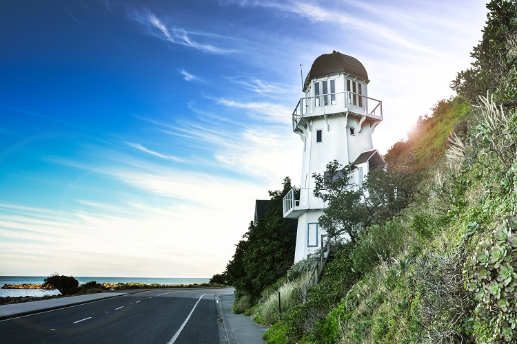 O The Lighthouse é um farol que foi construido por Bruce Stokell em 1994 para ser o ateliê de pintura da sua esposa, onde pode-se enxergar a Ilha Sul do outro lado do mar. O imóvel precisaria ficar bem no alto, foi então que surgiu a ideia de um farol, “o único tipo de construção com uma estrutura sólida à beira do mar”. “Por se tratar de um farol alto e com uma paisagem sem nenhuma vegetação alta em volta, tem-se a sensação de estar parado na proa de um navio”, conta Stokell. Ele também menciona todas as outras experiências relacionadas à vida em um farol, “viver aquele romance, sentir-se isolado do mundo, ficar de conchinha embaixo do cobertor enquanto há uma tempestade do lado de fora… e isso é o que não falta. Durante as chuvas torrenciais, o mar de Island Bay fica lindo, as ondas quebram nas pedras, e a água acaba espirrando até dez metros de altura. Dá gosto de ver”.