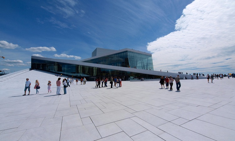Com exterior angulado e branco que parece surgir da água, a arquitetura da Opera House de Oslo convida os visitantes a subirem até o terraço e desfrutarem da vista panorâmica da capital. Janelas enormes ao nível da rua proporcionam ao público de fora belos vislumbres dos ensaios a atividades realizadas no edifício.
