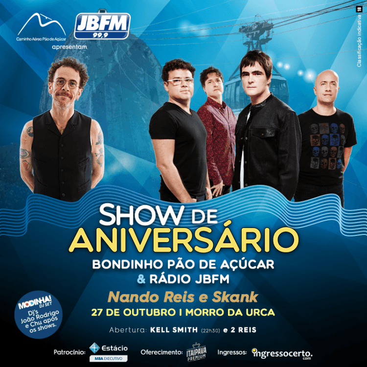 Em comemoração aos 16 anos de liderança da Rádio JBFM e os 105 anos do Bondinho Pão de Açúcar, o Morro da Urca receberá, no dia 27 de outubro, dois ícones da cena musical brasileira. Nando Reis e Skank, que prometem uma noite inesquecível e cheia de surpresas. Kell Smith e 2 Reis (formada pelos filhos de Nando Reis) também já confirmaram presença nessa noite especial.