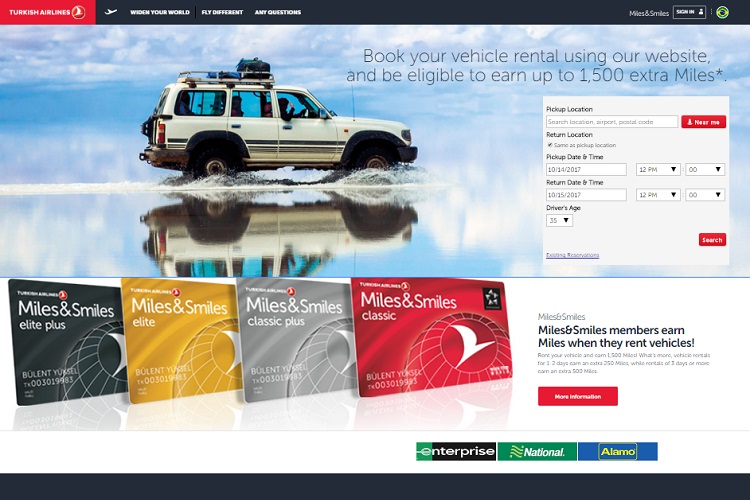 Os passageiros que alugarem um carro nos canais de vendas on-line da Turkish Airlines, tem a oportunidade de ganhar até 1500 milhas*. Além dessas vantagens, o passageiro também terá a oportunidade de alugar um carro com preços com desconto através de campanhas especiais a serem organizadas em determinados períodos.
