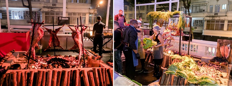 O cardápio da festa, assinado pelo chef-executivo do Copa, David Mansaud, foi um verdadeiro banquete. Os detalhes rústicos de madeira acompanharam o buffet de antepastos, estações de saladas, pratos quentes e sobremesas. Na varanda, um varal de aves, suínos e cordeiro preparados no fogo de chão pela FM Parrillas assava e defumava carnes e peixes que eram servidos na hora – e o resultado foi realmente bem diferenciado e saboroso.