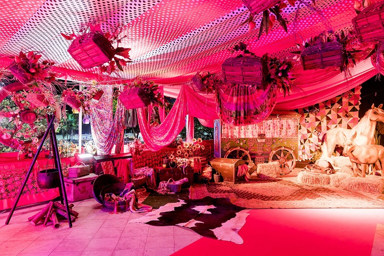 A festa, realizada no dia 10 de fevereiro, levou muitos curiosos à entrada do hotel, onde fica o tapete vermelho – uma multidão do lado de fora assistia, animada. Logo na recepção, um grupo de dançarinos e violinistas faziam danças ciganas para entreter a chegada dos convidados, que ao acessarem a varanda que fica bem em cima do restaurante Pérgula, adentravam em um acampamento cigano, com carroças, cavalos e tendas com ciganas que “abordavam” os foliões para lerem o seu futuro.