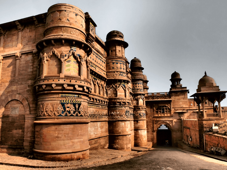 O forte é uma construção magnífica que fica em uma massa íngreme de arenito. É possível chegar lá por dois pontos distintos, ambos são feitos por caminhadas íngremes. Um de seus monumentos é agora usado como a Escola Scindia, que era originalmente exclusiva para nobres e príncipes.
