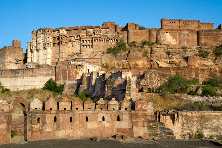 O Forte Mehrangarh é um dos maiores e mais bem preservados fortes da Índia. Foi construído em 1460 e fica a 410 pés acima da cidade de Jodhpur. Dentro de suas imponentes paredes espessas estão vários palácios com entalhes intrincados e pátios luxuosos.