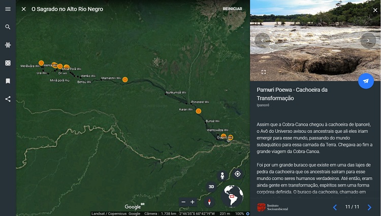 ISA (Instituto Socioambiental) e Google colocam no mapa, de maneira interativa, as histórias de alguns dos lugares sagrados para os povos da família Tukano nos rios Negro e Uaupés, no noroeste da Amazônia. Partindo de Manaus Rio Negro acima, o leitor pode navegar por 11 pontos na plataforma do Google Earth. Em cada um deles, uma história do tempo da criação do Mundo para os povos tukano.