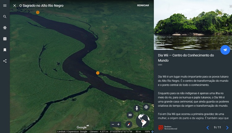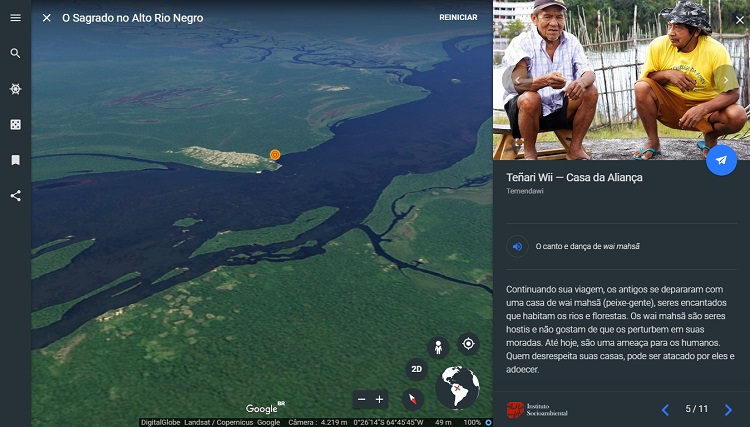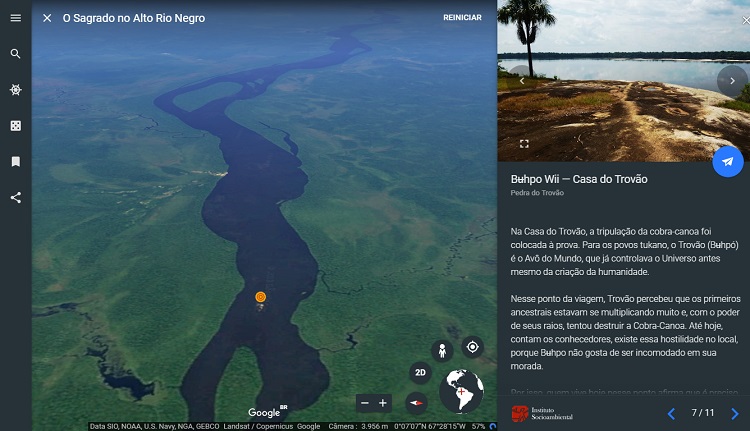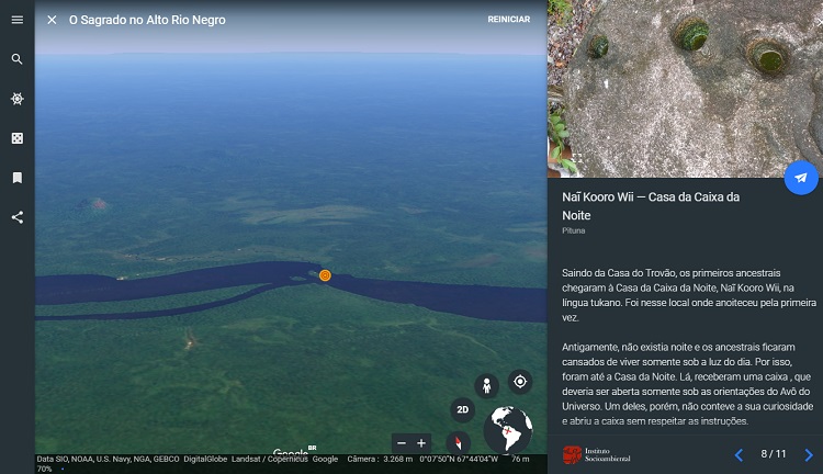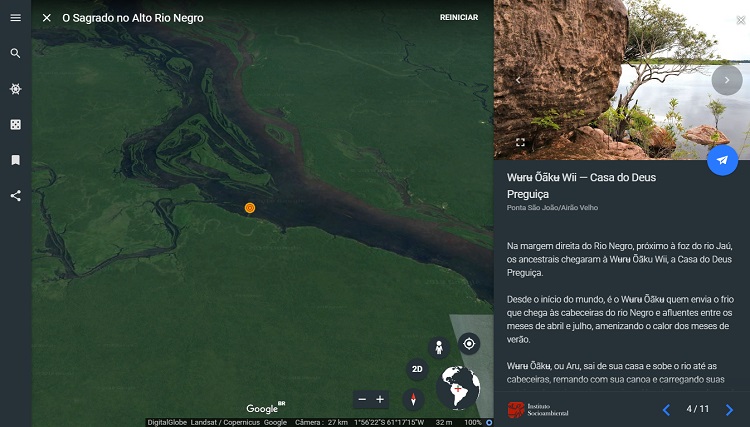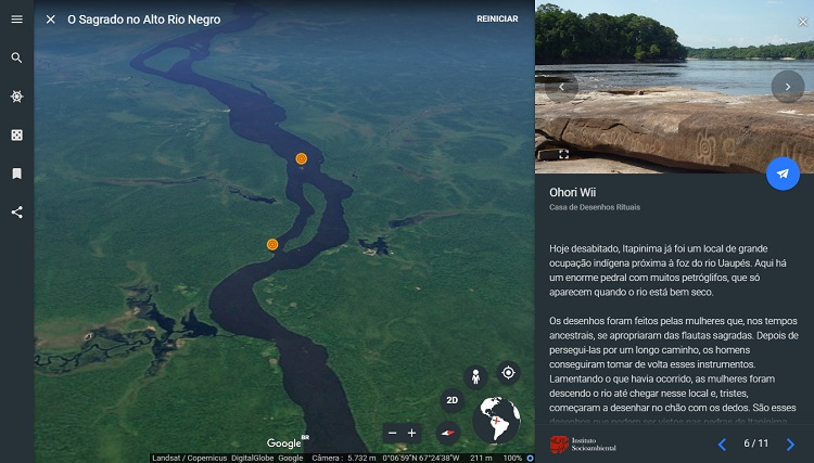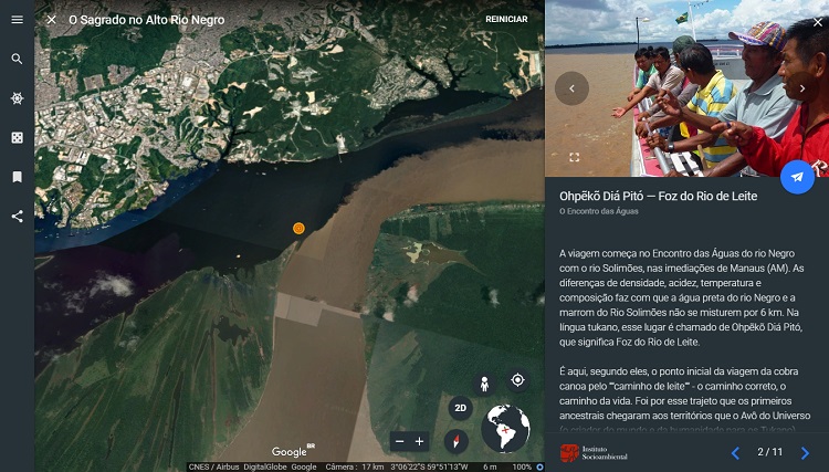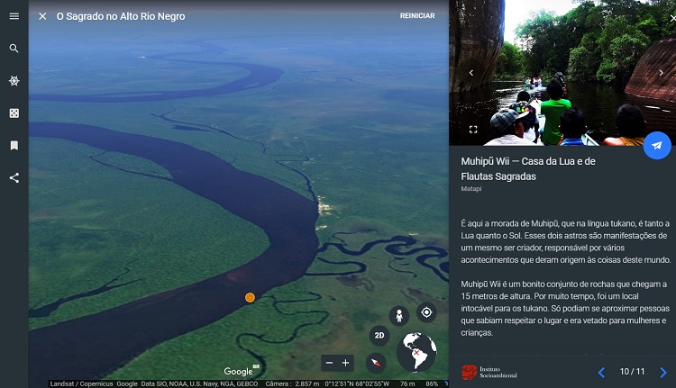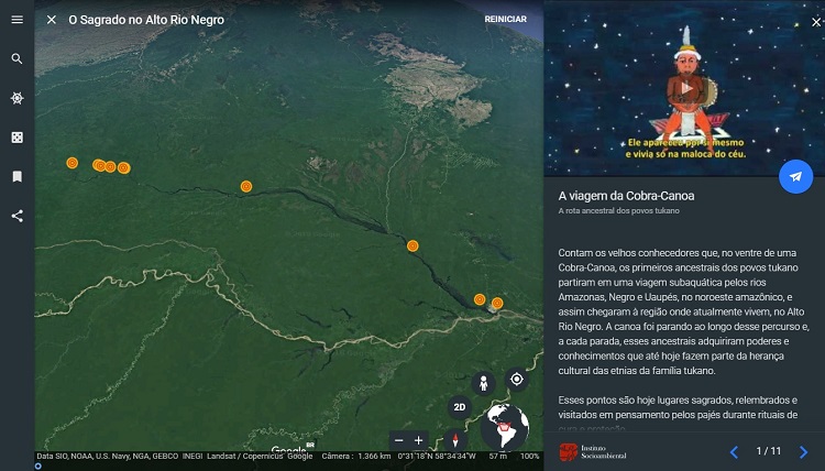 ISA (Instituto Socioambiental) e Google colocam no mapa, de maneira interativa, as histórias de alguns dos lugares sagrados para os povos da família Tukano nos rios Negro e Uaupés, no noroeste da Amazônia. Partindo de Manaus Rio Negro acima, o leitor pode navegar por 11 pontos na plataforma do Google Earth. Em cada um deles, uma história do tempo da criação do Mundo para os povos tukano.