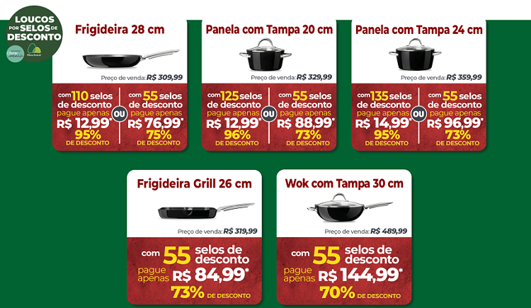 A cada R$20,00 em compras (doações, tabaco, fumo, medicamentos e serviços não participam da troca) você recebe um selo de desconto. Você também pode contar com a ajuda dos produtos aceleradores para conquistar ainda mais selos de desconto!